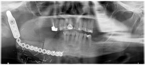The procedure used in Orthognathic surgery is known as Mandibular Osteotomy. The operation is undertaken through an incision made at the back of the mouth in the gum by the molar teeth to gain access to the jaw. The lower jaw is then cut in an oblique fashion with a small saw to allow it to be broken in a controlled manner. It is then moved into its new position, which has been predetermined during surgical planning with the aid of models of your teeth. A small plastic wafer is attached to the teeth to allow the new position of the lower jaw to be determined, which is then fixed into place with small metal plates and screws. These are made of titanium that is a very inert metal and safe to be used in the body. The gum is stitched back into place with dissolvable stitches.